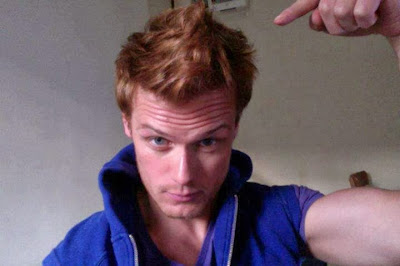 Now, granted enough, the first OFFICIAL pic we've seen of Sam as Jamie (here seen again below) is not very indicative of his hair color. Obviously the pic was taken when the sky was overcast so his hair looks a bit more auburn-brownish but Diana Gabaldon has explained red hair in detail enough so I trust it's the RIGHT COLOR. (Poor guy, 27 hours in the chair!)